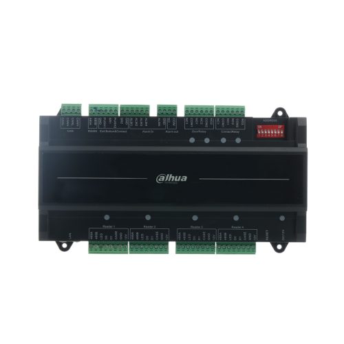 Dahua, ajtóvezérlő, TCP/IP, CAN H, CAN L, Wiegand26/34 bit, RS-485, 5 db kimenet összesen, 2 x ajtózár, 2x kioldó szenzor, 2 riasztó, 9 db bemenet max., 2x ajtóérzékelő, 2 x kilépő gomb, 5 x riasztó, 12 V DC