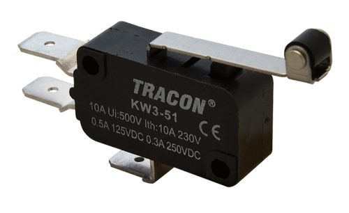 Tracon KW3-51 Mikrokapcsoló, 10 A, 10,3 x 15,9 x 27,8 mm, karos görgős