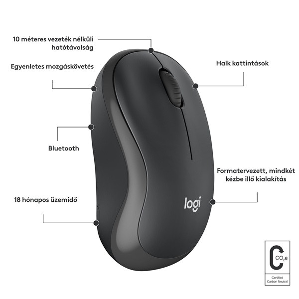 A kéz természetes vonalát követő, kényelmes, ívelt kialakítással hosszabb időt át hatékony maradhat. A kis méretű és vezeték nélküli egér könnyedén elfér a laptopjával egy táskában – így akárhol dolgozik, mindenhová magával viheti. Az M240 Silent készüléket úgy terveztük, hogy bal- és jobbkezes felhasználók számára egyaránt kényelmes legyen.