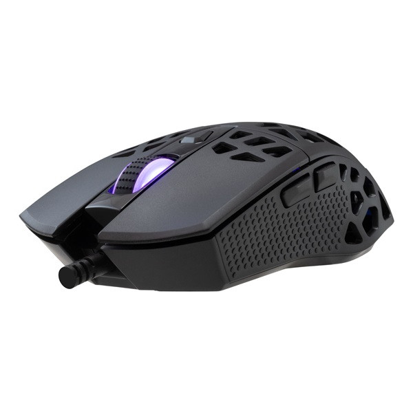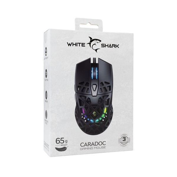 White Shark CARADOC-B, GM-5018B gamer egér, fekete, 7200dpi 7D – 7 gombos kivitel, Instant A825F chipset, Felbontás: 1200 / 1600 / 2400 / 3200 / 4800 / 7200 DPI, RGB háttérfény, Kábelhossz:1,8m. Szövet borítású hajlékony kábel, 3 év garancia